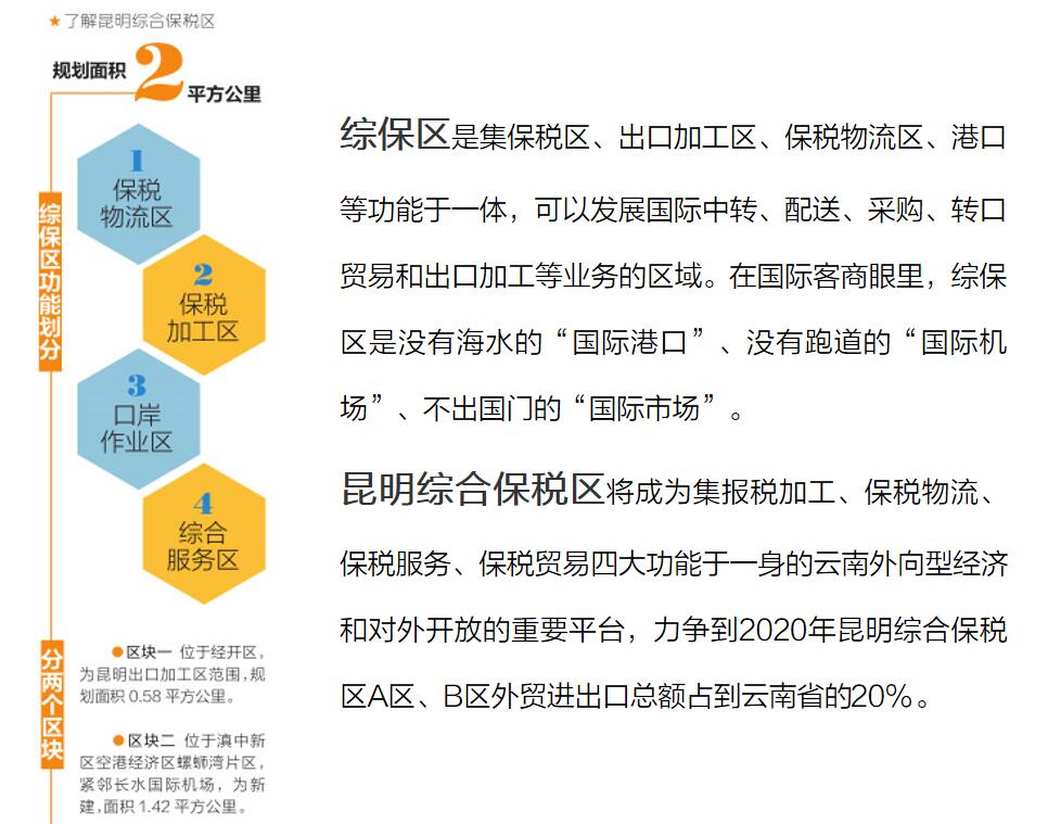 昆明將利用綜合保稅區(qū)這一特有的功能政策優(yōu)勢(shì),積極與世界“對(duì)話”,積極聯(lián)通國(guó)內(nèi)國(guó)外“兩個(gè)市場(chǎng)”和“兩種資源”,集聚各類(lèi)高端生產(chǎn)要素,把昆明打造成為面向西南開(kāi)放的區(qū)域性國(guó)際貿(mào)易中心、物流樞紐中心、金融中心、信息中心、總部聚集中心、旅游文化中心和開(kāi)放平臺(tái),進(jìn)一步增強(qiáng)昆明面向南亞?wèn)|南亞的影響力、輻射力、帶動(dòng)力。
