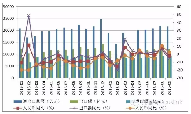 圖表 1 2015年1月-2016年9月我國(guó)進(jìn)出口貿(mào)易逐月情況對(duì)比