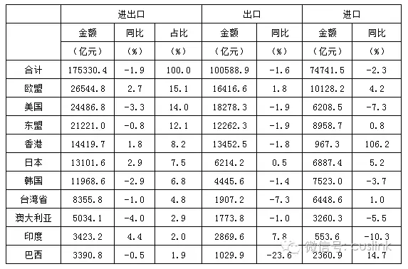 圖表 2 2016年前三季度中國(guó)前十大貿(mào)易伙伴進(jìn)出口情況